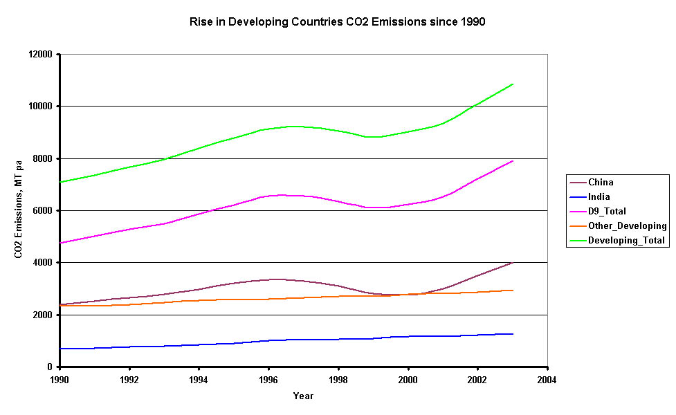 The second graph (Dev_CO2) shows that the bulk of the emissions from the 150 or so developing countries come from just nine countries. Of those nine, the emissions from China and India really stand out. The emissions from China alone exceed those of the rest of the developing countries combined, and the curvature of the Chinese emissions is reflected strongly in the total emissions from the top nine countries. The dip in Chinese emissions between 1996 and 2000 resulted from the abolition of state subsidies on the price of coal which accounts for the bulk of their emissions. Sustained rapid economic growth has caused emissions to start rising again. There is clearly a rise in emissions across the board and emissions from China and India dominate the rest. The other members of the top nine countries (in descending order) are South Korea, Saudi Arabia, Mexico, Iran, Indonesia, South Africa and Brazil. While these nine countries should all be making an effort to restrain the growth in emissions, there must absolutely be something done to reign in emissions from China and India if global emissions are to be stabilised, let alone reduced. However, since they are poorer than western countries, they should be helped by the western countries to reduce their emissions. The Clean Development Mechanism (CDM) already exists for this purpose, but it is not enough. The USA and Australia have proposed the extension of the CDM to cover “clean coal”, geosequestration and nuclear power, but green NGOs adamantly oppose this.