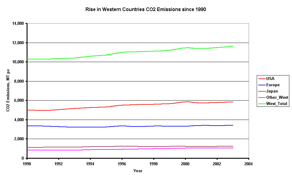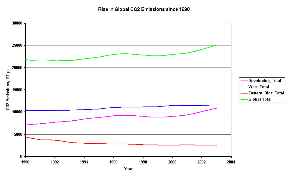 The third graph (West_CO2) shows that while Europe and Japan have been able to keep their emissions approximately constant over the last 15 years, the USA and other western countries outside Europe (including Australia) have not. Hence the Western total shows a steady increase, and were it not for the fall in emissions from Eastern Bloc countries that I referred to above, total emissions from the developed countries would have risen rather than falling as they have appeared to do. Europe and Japan have been rather smug about their efforts in restraining the growth of their emissions, but the lack of action by the USA, Australia and the developing countries has nullified the effect of their efforts on global emissions. Unless we all pull together in future, and help both the Eastern Bloc countries and the Developing countries to reduce their emissions, then global emissions will continue to rise and irreversible climate change would appear to be inevitable. It is really time to stop the finger pointing and get on with realistic strategies to make deep cuts in global CO2 emissions as quickly as possible. It will not be pretty, but the alternative is worse.